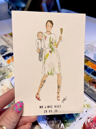 With over 10 years of illustration experience, I bring both skill and personality to your day. My beautifully hand painted illustrations blend chic fashion elegance with a fun, whimsical twist! Each illustration is thoughtfully drawn to reflect not just outfits, but also each person’s body shape and personality. Because of this attention to detail, couples and guests instantly recognise their friends and family in the paintings. I’m chatty and friendly, putting your guests at ease and making the live illustration experience fun and engaging. You’re not just booking an artist—you’re inviting someone who will enhance your day with creativity, care, and fun!